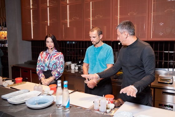 После в зал была приглашена специальная гостья, актриса Асаль Шодиева, котороя вместе с Александром приготовила два простых, но изысканных блюда — поке с лососем и hand-ролл с угрем, процесс контролировал шеф-повар Олег Чакрян.