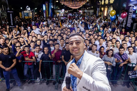 В качестве организатора мероприятия выступила Торговая марка Adrenaline Rush, поэтому на площадке царил дух абсолютной энергии. Сотни поклонников собрались на Ташкентском бродвее, чтобы лично поздравить нашего чемпиона с ошеломляющей победой, которую он одержал за 30 секунд в бою с экс-чемпионом мира Дарлисом Пересом.