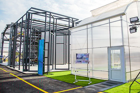 В завершении презентационной части гости отправились к экспозиции, развернувшейся под открытым небом, где каждый смог подробно познакомиться с продукцией и готовыми решениями от AKFA Build. Здесь были представлены модельный ряд модульных домов, автоматических многоярусных парковок, теплиц, металлоконструкций и производственных помещений с использованием сэндвич-панелей.