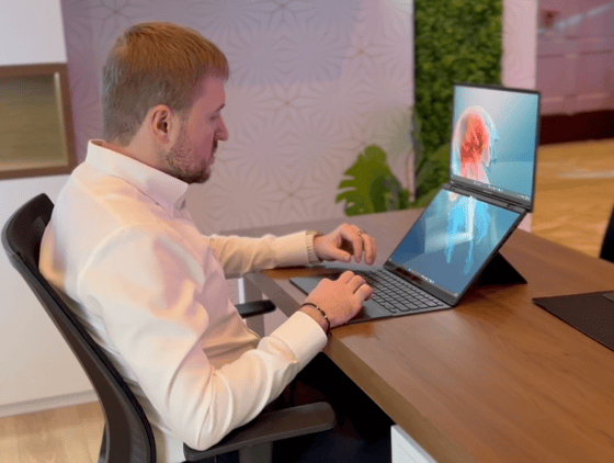При раскрытии дисплейной крышки на 180° два идентичных дисплея Asus Lumina OLED с соотношением сторон 16:10, разрешением 3K и частотой обновления 120 Гц образуют единый большой экран диагональю 19,8 дюйма, который благодаря встроенной в корпус подставке можно устанавливать вертикально или горизонтально, поэтому Zenbook Duo (2024) можно эффективно использовать во множестве различных сценариев.