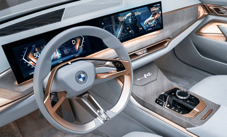 Главной фишкой интерьера электрокара i4 от компании BMW стал большой дисплей, объединивший в себе цифровую приборную панель и экран мультимедиа. В конструкции монитора использовали специальное стекло с неотражающей поверхностью для более четкого изображения. Мультимедийный комплекс имеет можно настраивать под свой вкус, а еще он понимает жесты. Машина была представлена весной 2020 года, однако ее серийное производство наладят только в третьем квартале 2021 года.