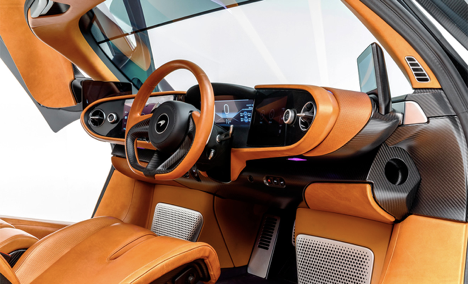 Невозможно вести разговор о технологичных и стильных медиасистемах без упоминания космического каплевидного салона гиперкара McLaren Speedtail. В этом автомобиле водитель находится в центре, а пара пассажирских сидений расположены слева и справа от водительского кресла. Вокруг трехспицевого руля установлены экраны, а кнопки управления опциями, клавиши стеклоподъемников и динамическими режимами находятся на потолочной консоли. На центральном третьем дисплее перед водителем мелькают большие цифры скорости и основные показатели приборов.