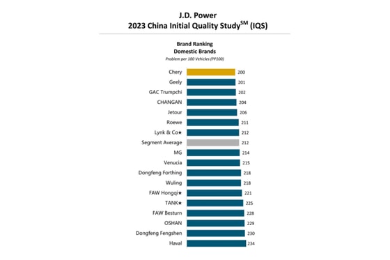 31 августа компания J.D. Power опубликовала «Первоначальное исследование качества в Китае (IQS) за 2023 год». Среди всех китайских брендов Chery занимает первое место по качеству новых автомобилей, поднявшись на одну позицию по сравнению с 2022 годом. Модели Chery Arrizo 6 Pro и Chery Tiggo 4 Pro заняли первое место в сегменте компактных седанов и компактных внедорожников соответственно.