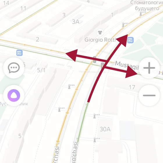 Если брать участок дороги от Ц1 в сторону здания «Тошшахартрансхизмат», то он имеет три полосы для движения, где с первой следует повернуть направо, со второй и третьей — прямо. Налево поворачивать не разрешается.