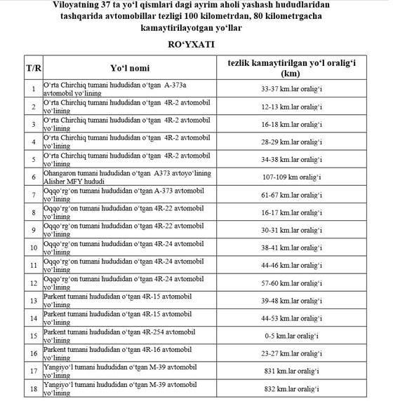 В Ташкентской области на 37 участках дорог вне населенных пунктов допустимую скорость движения автомобилей снизили со 100 до 80 км/ч. Об этом говорится в решении хокима области.