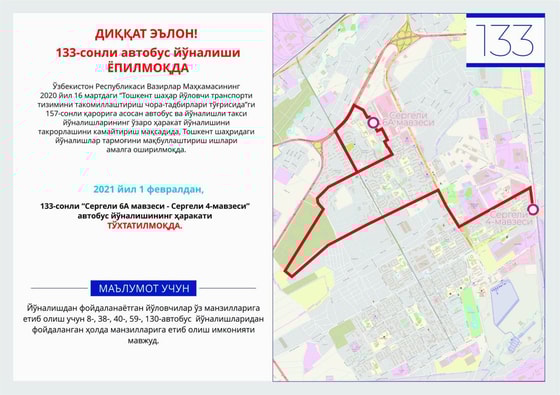 В соответствии с требованиями Постановления Кабинета Министров Республики Узбекистан № 157 от 16 марта 2020 года «О мерах по улучшению пассажирской транспортной системы города Ташкент», в целях регулирования и оптимизации сети маршрутов, с 1 февраля 2021 года закрывается автобусный маршрут №133 «Массив Сергели 4 - Массив Сергели 6А».