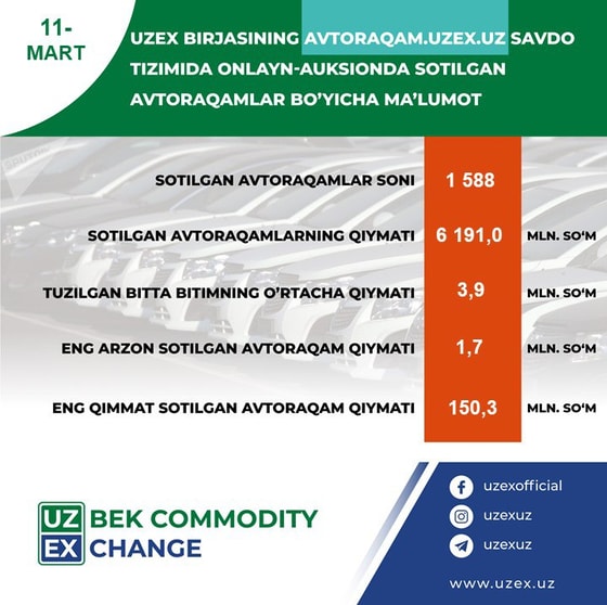В Узбекистане 11 марта за сутки были проданы автомобильные номера на сумму свыше 6,191 млрд сумов, сообщает UZEX.