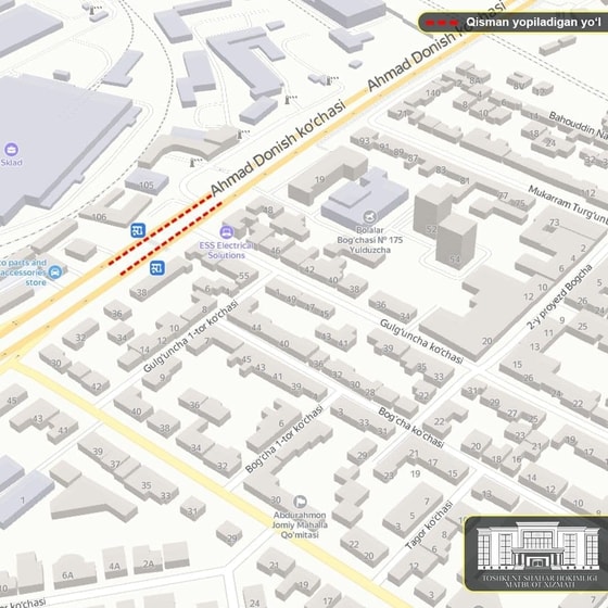 11 марта текущего года на участке улицы Ахмада Дониша в месте пересечения с улицей Гулгунча (Ашурова) будет закрыта одна из полос по обе стороны проезжей части для движения транспорта.