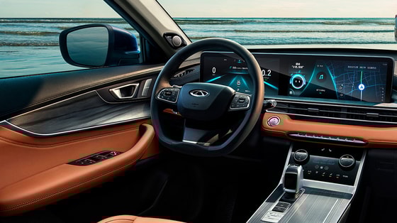 Передняя панель в интерьере представляет собой некий микс из элементов других моделей, делится Tarantas. Сдвоенный экран позаимствован у полноприводного Tiggo 8 Pro Max. Блок климат-контроля с регулировками остался прежним. Накладка центрального тоннеля та же, что на полноприводном Tiggo 7 Pro, который в скором времени появится на других рынках.