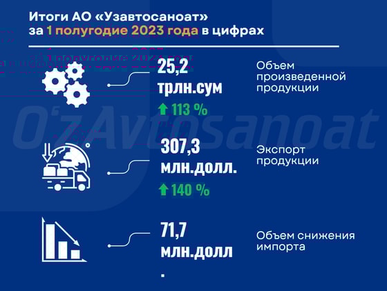 Понимая важность наращивания объемов экспорта, который приносит стране валютные поступления, структурными предприятиями «Узавтосаноат» было экспортировано продукции с высокой добавленной стоимостью на сумму $307,3 млн, что на 40% больше, чем за аналогичный период прошлого года. В результате реализации программы сокращения импорта за первое полугодие 2023 года удалось сократить импорт на $71,7 млн.