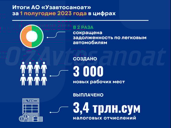 За первое полугодие в структуре «Узавтосаноат», благодаря реализации новых проектов, было дополнительно создано 3000 рабочих мест. Наращивание объемов производства позволило сократить задолженность по легковым автомобилям в 2 раза, а также увеличить объем налоговых отчислений в бюджет до 3,4 трлн сумов.