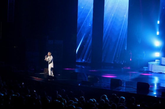 Также Басков исполнил одну композицию с певицей Валерией, которая не смогла прилететь в Ташкент лично, но подпевала Николаю с экранов.