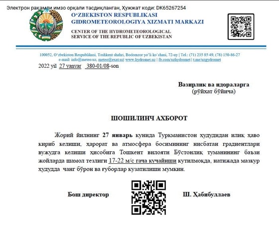 27 января в Бостанлыкский район Ташкентской области местами настигнет пыльная буря, сообщает Узгидромет.