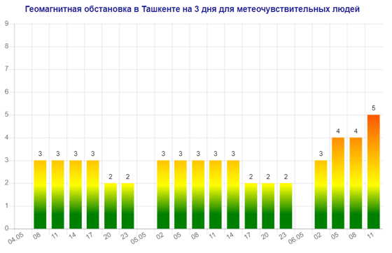 Послезавтра (6 мая) в Ташкенте будет наблюдаться магнитная буря мощностью пять баллов, следует из данных сервиса Meteonova.