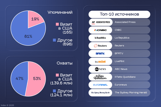 За исследуемый период Узбекистан всего упоминался в 861 публикациях в онлайн СМИ дальнего зарубежья с охватом 264 млн контакта. При этом 165 упоминаний прямо или косвенно были посвящены рабочей поездке президента в США, с охватом 137 млн контакта. Таким образом, 19% всех упоминаний и 53% всех охватов про Узбекистан были связаны с рабочей поездкой Шавката Мирзиёева.