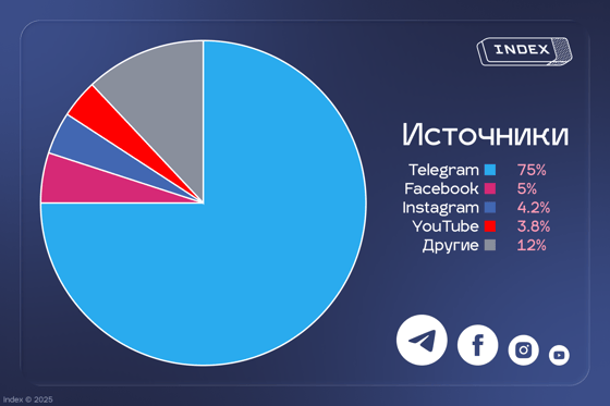 88% всех упоминаний пришлись на основные соцмедиа — Telegram, Instagram Facebook, YouTube. Оставшиеся 12% были обеспечены СМИ и другими источниками.