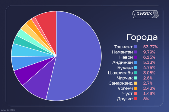 В топ 5 городов по упоминаниям входят: Ташкент (53,77%), Наманган (9,79%), Навои (6,15%), Андижан (5,13%), Бухара (4,75%).