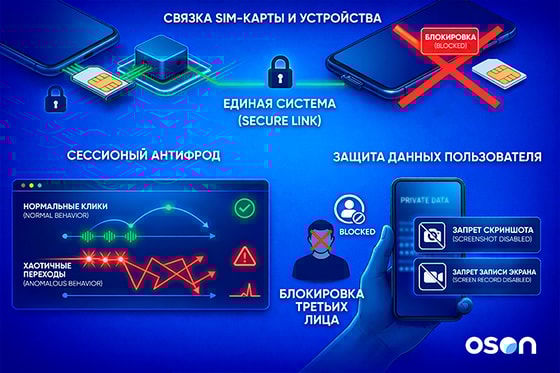 Дополнительно в OSON применяется сессионный антифрод, который отслеживает поведение пользователя внутри приложения в режиме реального времени. Система анализирует скорость и характер нажатий, переходы между разделами, частоту и логику совершаемых операций. К примеру, если поведение пользователя не соответствует стандартным сценариям и фиксируются слишком быстрые клики, попытки обхода логики приложения, подозрительные переходы или множественные неудачные попытки подтверждения финансовых операций, то система автоматически повышает уровень риска и может заблокировать текущую сессию.