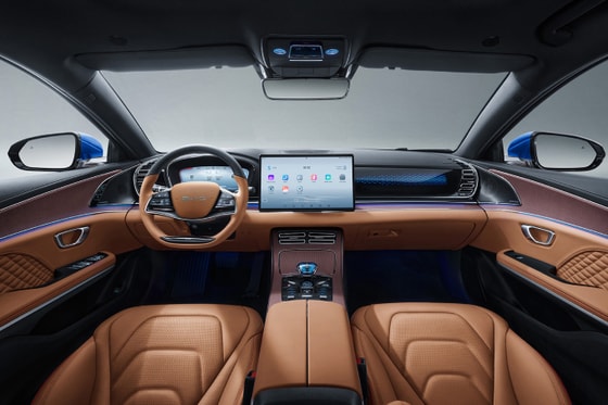 В машине установлен вращающийся экран Dilink 15,6 дюймов с поддержкой Bluetooth, 4G, SG, широкоугольный видеорегистратор 1080Р HD, премиальная акустика фирмы DYNAUDIO и беспроводная зарядка для телефона.