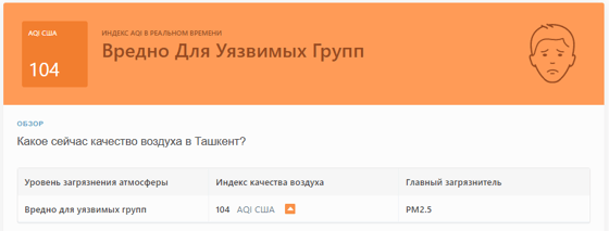 Так, в 08:40 станция мониторинга в столице Узбекистана показывала результат в 104 AQI. Концентрация PM2.5 — в 7,4 раза выше рекомендуемого ВОЗ среднегодового значения качества воздуха.