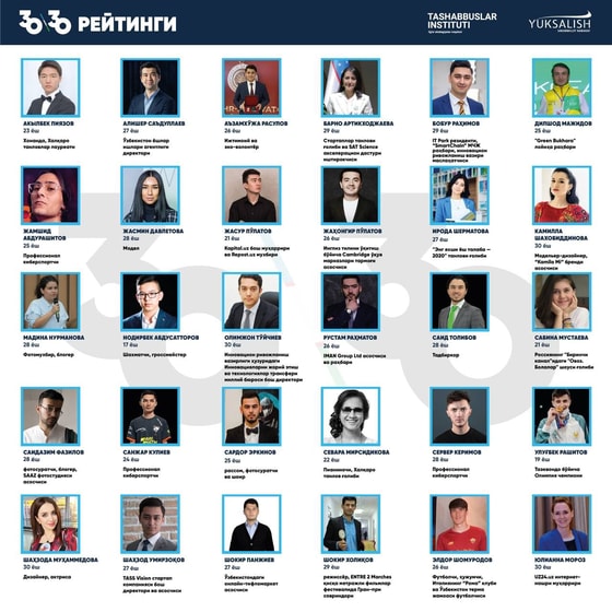 Символичный рейтинг «30/30» был составлен в преддверии 30-летия государственной независимости Узбекистана при участии экспертов. Первоначально был сформирован лонг-лист из 100 человек в 10 номинациях, после чего кспертный совет специалистов по каждой категории совместно со специалистами «Юксалиш» выбрали 30 самых перспективных молодых людей до 30 лет – по три победителя в каждой номинации.