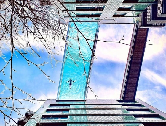 Отмечается, что данный бассейн спроектирован архитекторами, работавшими над Сиднейской оперой. Бассейн расположен на высоте 35 метров над землей и скорее напоминает стеклянный мостик, связывающий крыши двух соседних зданий.