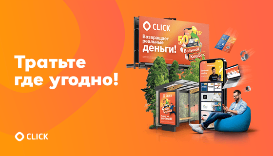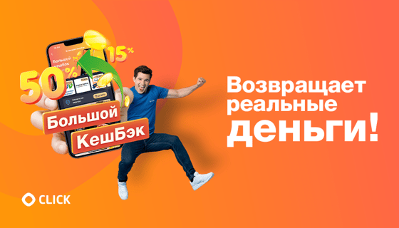 Большой КешБэк от CLICK возвращает до 50% реальных денег от суммы, потраченной на покупку товара или сервиса у партнеров. Как это работает? Пользователь отправляется в магазин или кафе, или любое другое заведение, которое является партнером Большого КешБэка. После покупки товара или услуги, он получает до 50% реальных денег на свой CLICK-Кошелек. Размер КешБэка индивидуален для каждого партнера. Именно они устанавливают, какой процент от потраченной суммы будет возвращен пользователю. Самое главное, Большой КешБэк не обязывает тратить деньги в определенном месте, он просто возвращает часть денег. Тратить их можно где угодно.