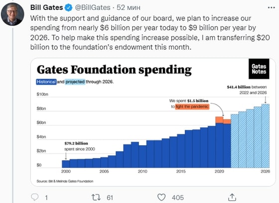 Мы планируем увеличить наши расходы с чуть менее $6 млрд сегодня до $9 млрд к 2026 году. Чтобы сделать это увеличение возможным, я перечислю в фонд $20 млрд в этом месяце, — добавил предприниматель.