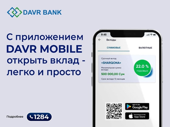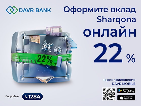 Обновленный срочный вклад «SHARQONA» предназначен на 13 месяцев, а процентная ставка составляет 22% годовых. Для удобства, открыть счёт можно через мобильное приложение DAVR MOBILE всего за пару минут!
