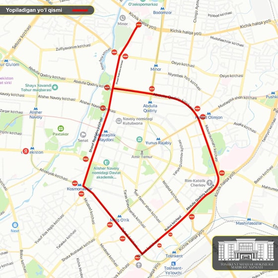 - улица Абдуллы Кадыри — от пересечения с улицами Истикбол и Нукус до пересечения с проспектом Шарафа Рашидова.
