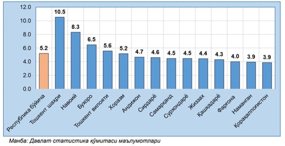 Отмечается, что в Ташкенте, Навоийской, Бухарской и Ташкентской областях уровень дохода оказался выше среднего уровня. Во всех остальных регионах средний доход на душу населения был ниже, чем в среднем по стране.