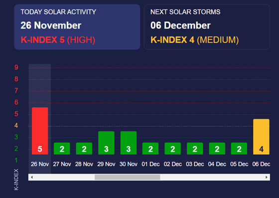 Согласно прогнозу, 27 ноября геомагнитный показатель опустится до низких значений.