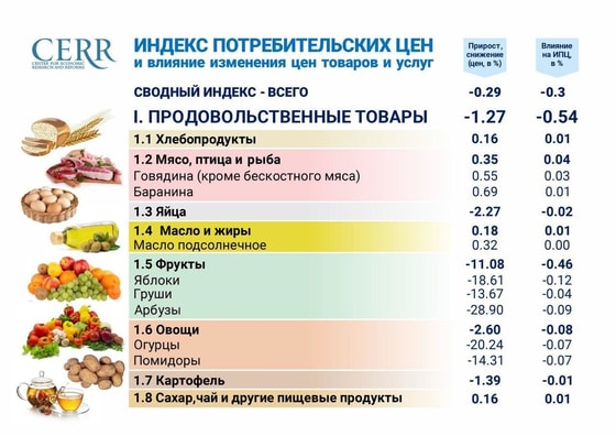 Продовольственные товары подешевели на 1,3 процента, что связано со снижением цен на плодоовощную продукцию -7,9 процентов и яйца -2,3 процента.