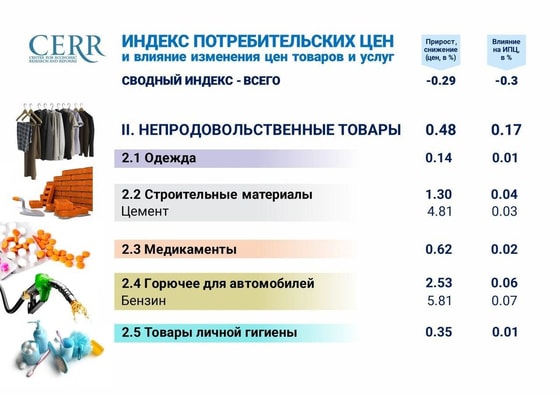 Непродовольственные товары поднялись в цене за месяц на 0,5 процентов, при этом наиболее значительно выросли биржевые цены на бензин 5,8 процентов. Но в целом с начала года цены на бензин снизились на 6,72 процента.