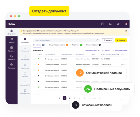 При использовании системы закупок Дидокс, задача создания, подписания, отправки и контроля статуса договора делается «по щелчку пальцев». Таким образом, ваше время и человеческие ресурсы могут быть затрачены не на этот контроль, а на достижение целей бизнеса.