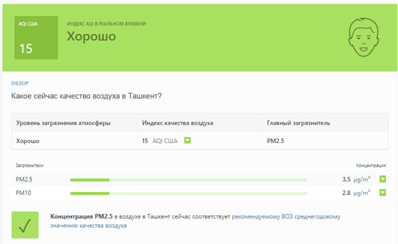 В 09:00 станция мониторинга в столице Узбекистана показывала результат в 15 AQI. Концентрация PM2.5 — соответствует рекомендуемому ВОЗ среднегодовому значению качества воздуха.
