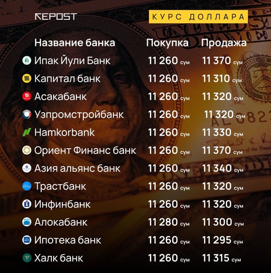 Коммерческие банки Узбекистана снизили курс доллара к суму. Многие банки скупают иностранную валюту по 11 260 сумов, а продают за 11 320 сумов.