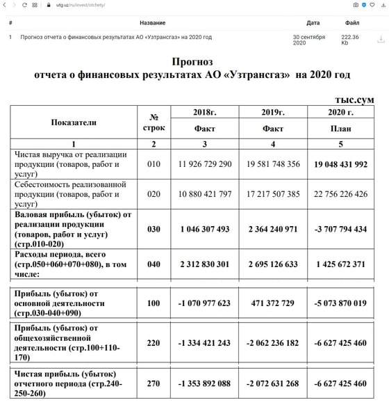Из отчётных и прогнозных данных АО «Узтрансгаз» видно, что при ожидаемом сокращении объёма выручки в текущем году по сравнению с 2019 годом на 2,7 процента резко – в 1,3 раза – возросла себестоимость. Если в 2018 году убытки акционерного общества от общехозяйственной деятельности составляли 1,3 трлн сумов, в 2019 году – 2,1 трлн, то в этом году они ожидаются на уровне 6,6 трлн сумов.
