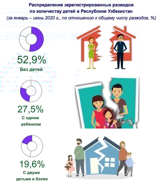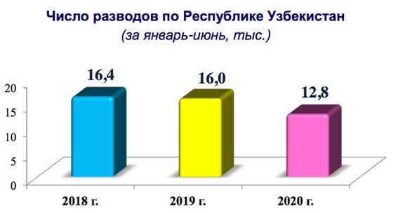 За период с января по июнь 2020 года было зарегистрировано 12,8 тысяч разводов. По республике коэффициент разложимости на 1000 населения составил 0,8 промилле.