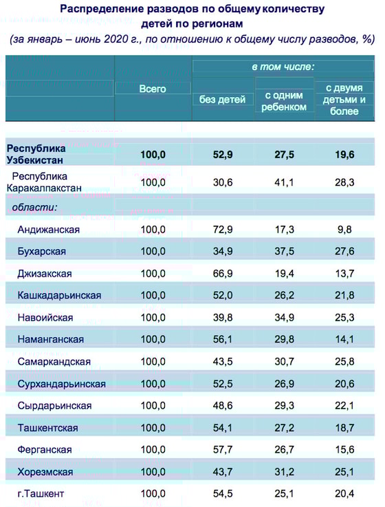 Самый высокий показатель разводов наблюдался в Ташкенте, Сырдарьинской, Андижанской и Навоийской областях, самый низкий - в Каракалпакстане, Кашкадарьинской, Хорезмской и Сурхандарьинской областях.