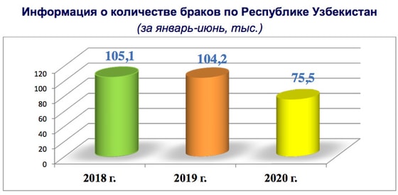 По регионам за январь-июнь самый высокий коэффицент брачности был отмечен в Хорезмской области, Каракалпакстан, Сырдарьинской и Сурхандарьинской областях. Самый низкий - в Наманганской, Самаркандской, Навоийской и Джизакской областях.