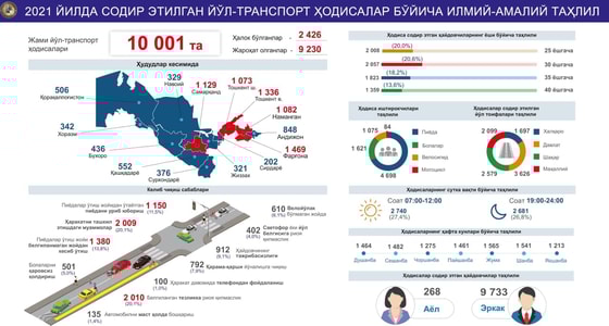 Наибольшее количество ДТП зафиксировано в Ферганской области — 1469, затем идет Ташкент — 1 073, а наименьшее количество в Сырдарьинской области — 202.