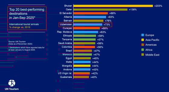 По итогам января-сентября 2025 года Узбекистан вошел в топ-10 стран мира с наивысшими темпами роста привлечения иностранных туристов. Об этом сообщает Комитет по туризму со ссылкой на отчет World Tourism Barometer.