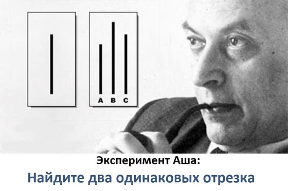 Человек спокойно называет правильный ответ, когда проходит этот тест в одиночестве. Но всё меняется, когда все окружающие в один голос дают неправильный ответ: 75 процентов ничего не подозревающих испытуемых хотя бы один раз, не поверив своим глазам, повторили неправильный ответ большинства, а 32 процента каждый раз называли неверные отрезки.