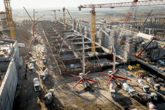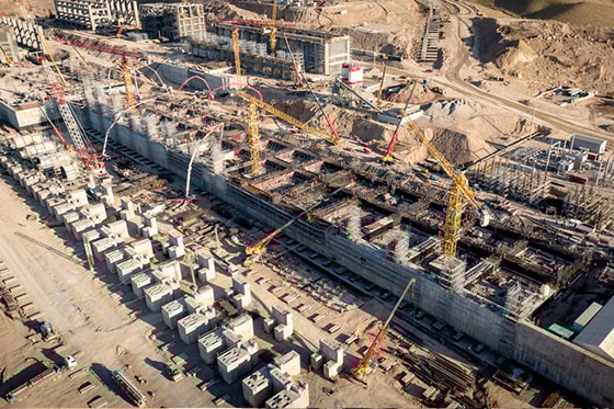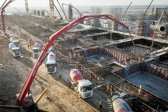 «В рамках проведения общестроительных работ осуществляются масштабные объемы работ по бетонированию. Так недавно состоялось очередное примечательное событие — на объекте корпус мелкого грохочения (КМГ) состоялась заливка фундамента и ригелей. Характерной особенностью этого события является тот факт, что данная операция стала самой крупной по объемам, проводимой когда-либо в нашей стране. В ходе нее было использовано 14 000 м³ бетона»,