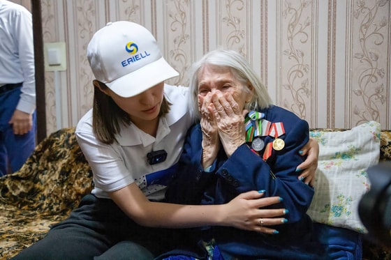 Анна Георгиевна Каримова не может сдержать слез, вспоминая о войне и своих однополчанах. Прошло 77 лет с окончания тех страшных событий, но боль о её погибших товарищах, только начинавших тогда жизнь, не стихает до сих пор. Когда началась война Анне было всего 17. Сегодня, когда Анна Георгиевна на пороге своего столетия, в ее глазах все еще можно увидеть задор молодой девушки, чью юность опалила война. Не случайно, первое, что спросила Анна Георгиевна у своей внучки, встречающей гостей от ERIELL Group – это в порядке ли её прическа. Трогательной и волнующей оказалась эта встреча, вечно молодая в душе Анна Каримова многое успела поведать своим гостям, плакала – вспоминая прошлое, улыбалась – думая о настоящем, смеялась – принимая от гостей комплименты. Для всех присутствующих она стала олицетворением женственности и героизма.