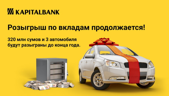 2 ноября «Капиталбанк» объявил результаты первого месяца розыгрыша по вкладам. По итогам октября 160 млн сумов и один автомобиль Chevrolet Nexia 3 были переданы победителям. А желающих выиграть один из призов ждут еще 320 млн сумов и 3 автомобиля - они будут разыграны до конца года.