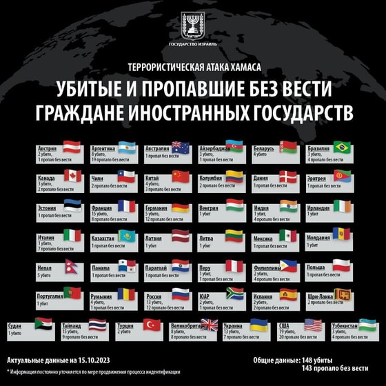 Уточняется, что по состоянию на 15 октября погибли 148 иностранных граждан, 143 пропали без вести.