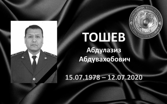 Руководство и личный состав Министерства внутренних дел глубоко скорбят в связи с безвременной кончиной старшего инженера-специалиста группы информационных технологий, связи и защиты информации УКД ОВД по Сергелийскому району города Ташкента подполковника Тошева Абдулазиза Абдувахобовича и выражают глубочайшие соболезнования родным и близким покойного, – говорится в сообщении МВД.