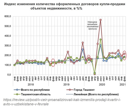 Жители Узбекистана купили 12 799 квартир в Ташкенте с апреля 2020 года, сообщили 18 июня 2020 года в пресс-службе министерства юстиции республики. Около 70 % сделок было оформлено жителями не из Ташкента. Можно предположить, что такой «бум» произошёл из-за того, что с 1 апреля 2020 года был отменен запрет на покупку жилья в Ташкенте и Ташкентской области жителями других регионов страны. Но на самом деле – в большинстве случаев – имело место переоформление ташкентских квартир на реальных собственников (лиц, на средства которых было приобретено жилье, оформленное затем на другое лицо, имеющее ташкентскую прописку).